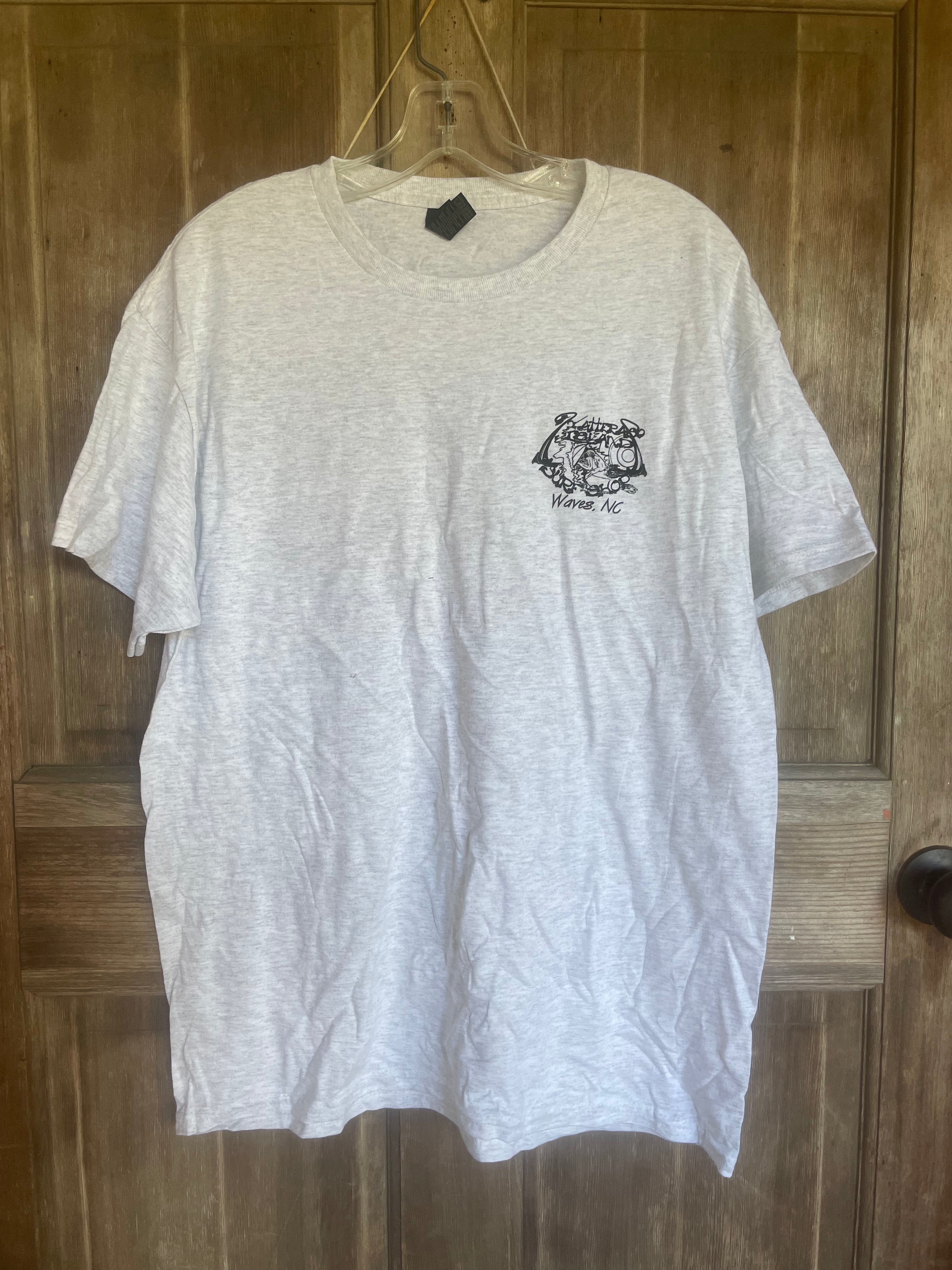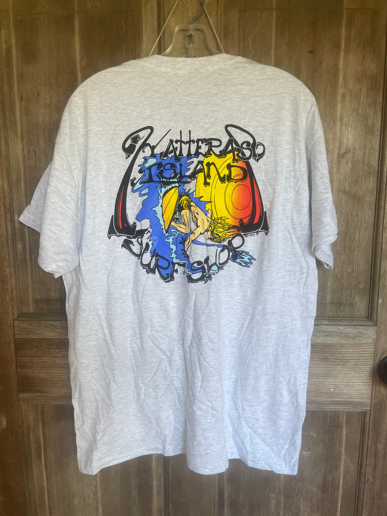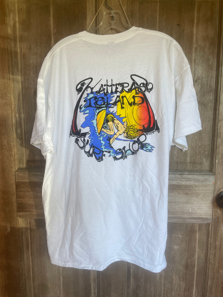 Impresión de surfista con letras de la tienda de surf Hatteras Island.